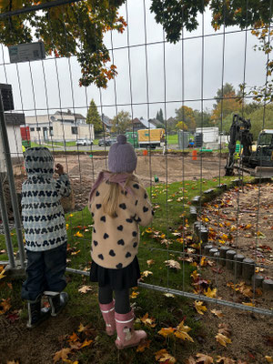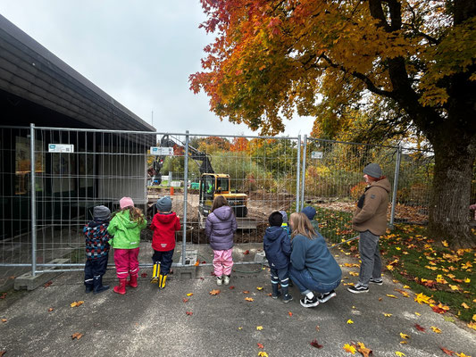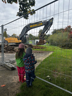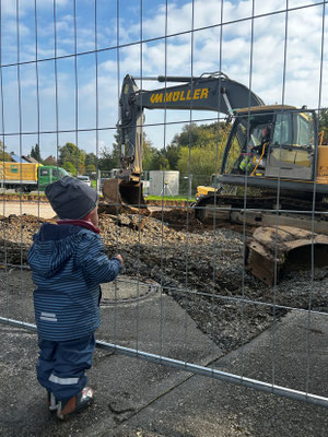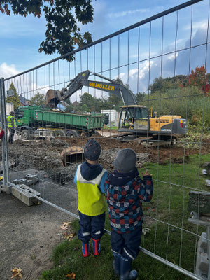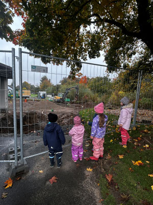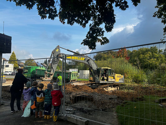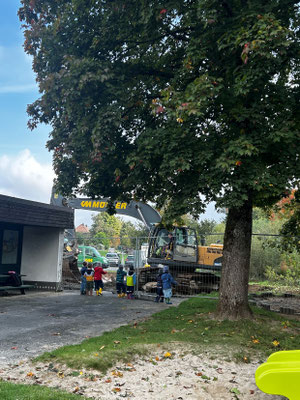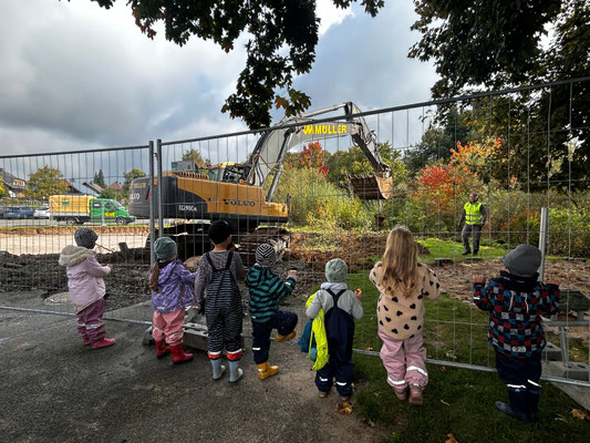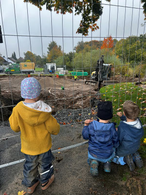 Von unserem Außengelände können die Kinder den Bauarbeitern gut zuschauen. Die großen Bagger und LKW`s sind ein besonderes Highlight in dieser Zeit.