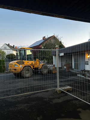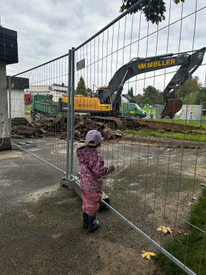 Ein großer Bauzaun steht zum Schutz für alle um die Kita herum. Die Erzieherinnen, sowie alle Eltern können den Parkplatz vor der Kita nicht mehr nutzen. Dieser muss für die großen Baustellenfahrzeuge freigehalten werden.