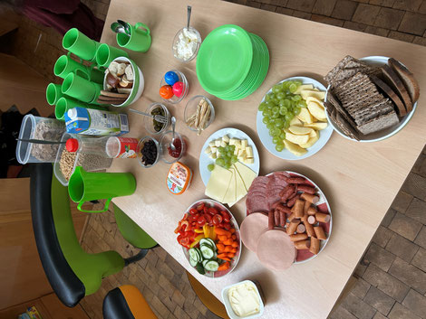 Zur Frühstückszeit gab es in den Gruppen ein Frühstücksbuffet Würstchen, Brot, Ketchup, eine Gemüseplatte, eine Obstplatte, kleine Küchlein und Apfelschorle.
